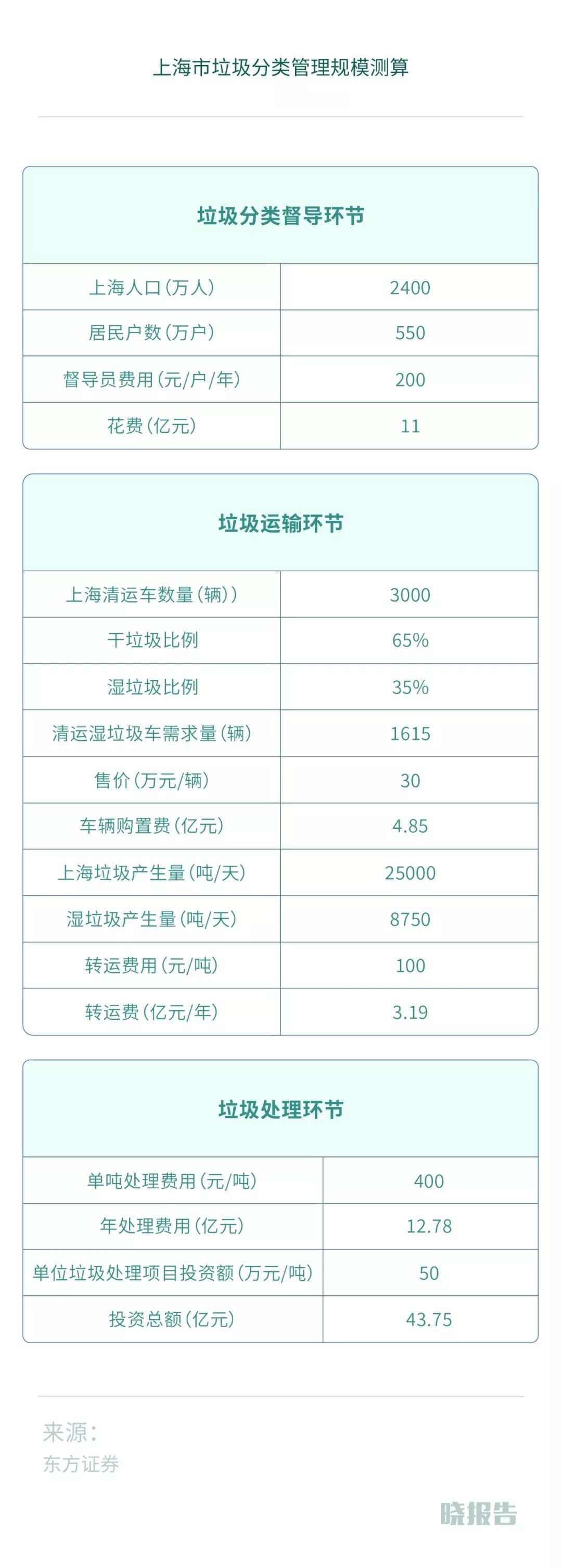 再加上之前提到的转运车,为了分类专用,需要配备装运不同类型的垃圾车。在处理环节,湿垃圾还需要专门建生产线,这部分的设施投入将达到43.75亿元。