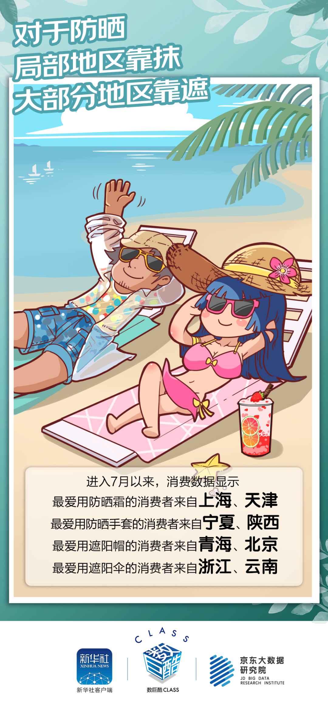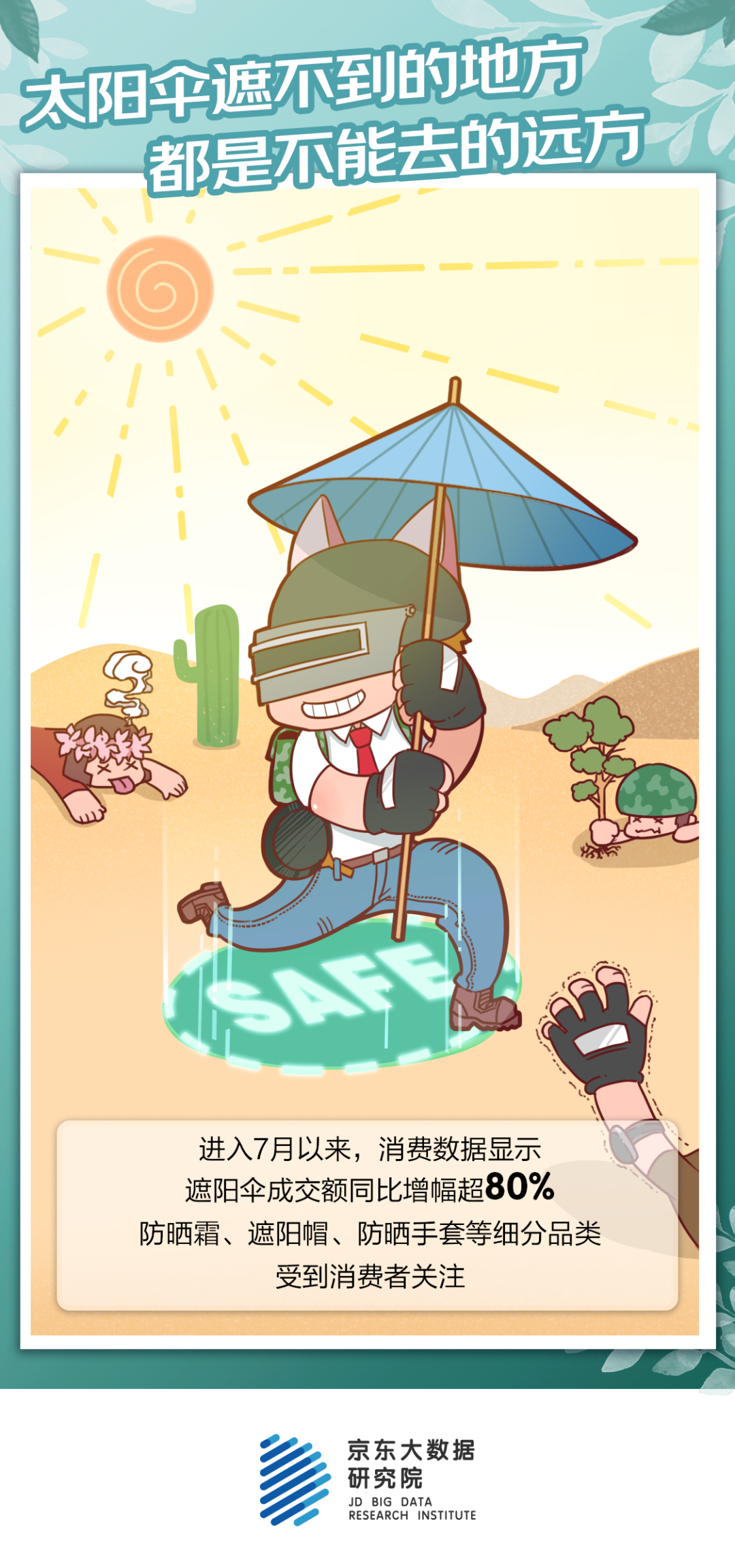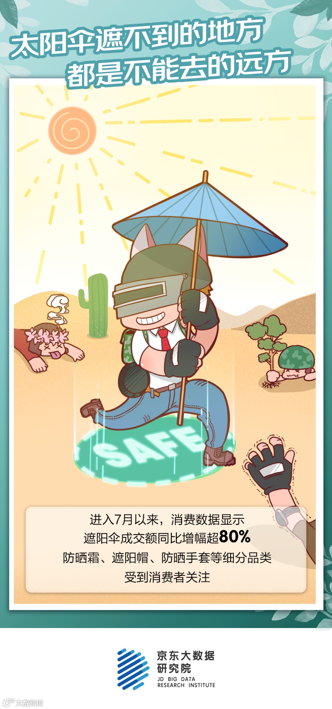 京东大数据近日发布的#暑伏清凉及美食消费趋势报告#显示,今年暑期遮阳伞成交额同比增幅超80%,防晒霜、遮阳帽、防晒手套等细分品类受到消费者关注。宝贝们,遮阳防晒请继续……