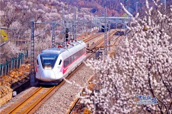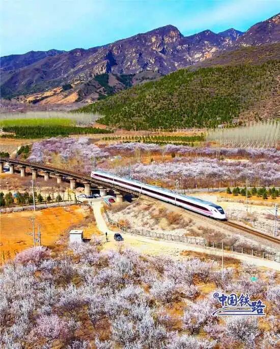 車体の真ん中にピンクのラインがデザインされている北京市郊外鉄道・懐柔密雲線(S5線)の「懐密号」は、ピンクに染まった山と密雲ダムの間を駆け抜け、慌ただしい都市での生活から一時離れて、美しい春の景色広がる郊外へと連れていってくれる。北京の市民には、郊外に日帰り旅行に行くという新しいレジャーの選択肢ができた。