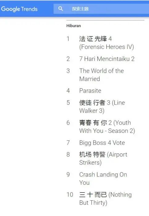 グーグルの検索統計・分析によると、20年、マレーシアの映画・ドラマ関連の人気検索ワードトップ10に、「法証先鋒4(Forensic Heroes IV)」や「使徒行者3」、「機場特警(Airport Security Unit)」などのドラマのほか、大ヒットアイドルオーディション番組「青春有你(Youth With You)2」、ドラマ「三十而已(Nothing But Thirty)」がランクインした。2019年には、ドラマ「親愛的、熱愛的(Go Go Squid)」や「全職高手(マスターオブスキル 全職高手)」がランクインしていた。