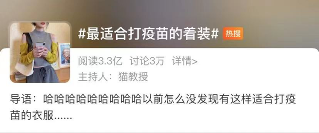 思わぬことがきっかけとなり、ネットユーザーの間でファッションのニュートレンドが登場することもある。中国では最近、「ワクチンを打つのに最も相応しい服装」という話題が微博(ウェイボー)で人気検索ランキングに入り、その閲覧数が3億3000万回を超えている。