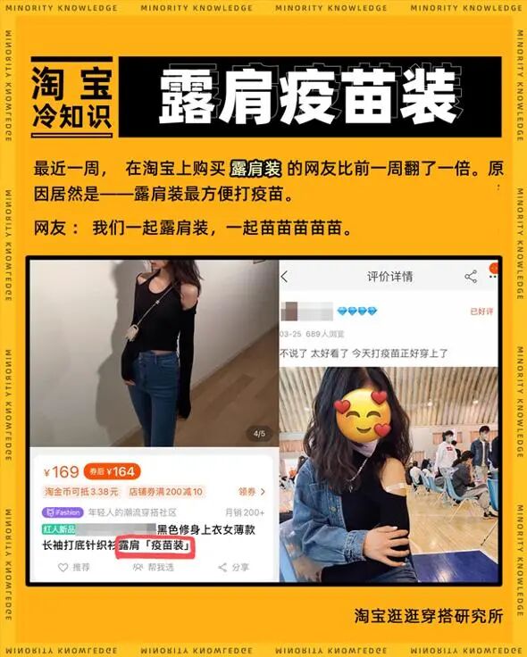 肩だしトップスがワクチンを接種する時に最も相応しい服装になるや、「ワクチンファッション」というキーワードで検索にヒットするように、商品の説明をいち早く変更した淘宝の店主も見られた。