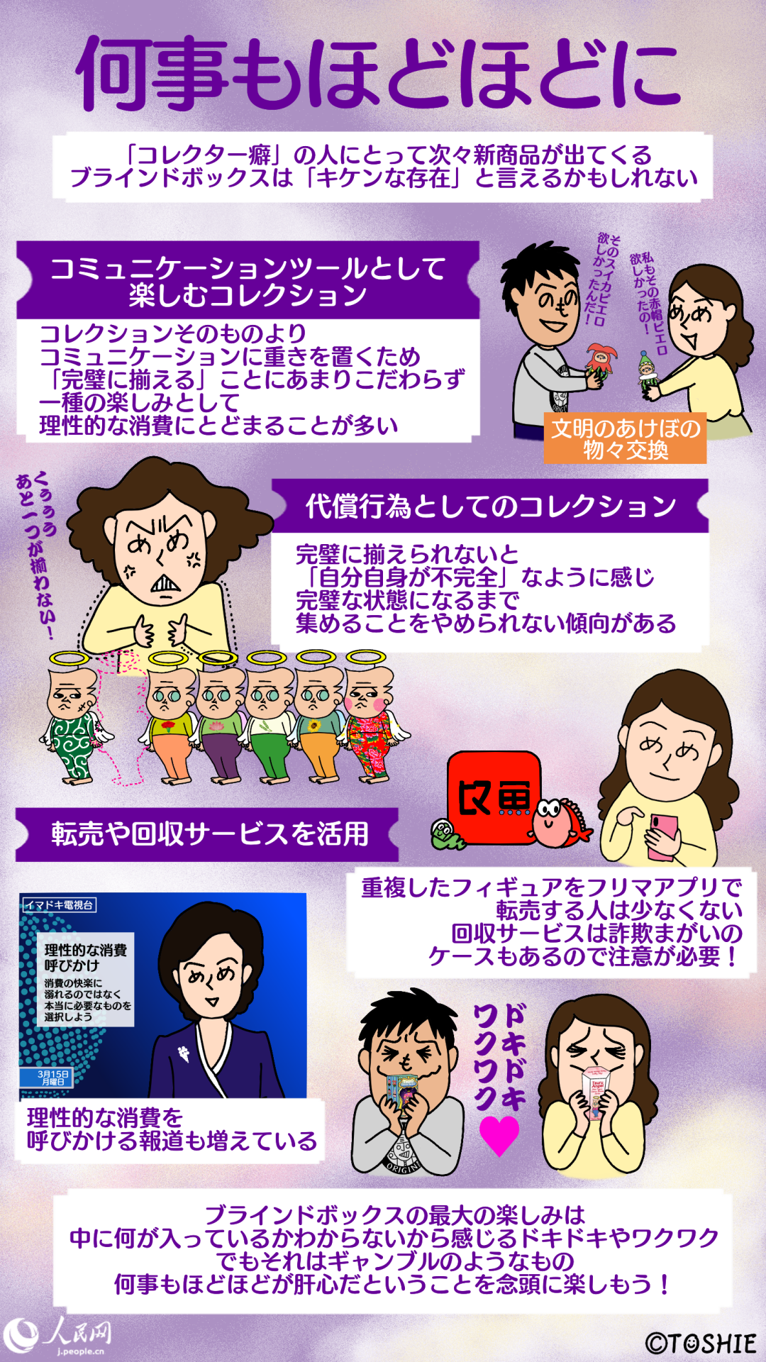 そのため、ブラインドボックス人気の過熱を受けて、関連報道などには理性的な消費を呼びかける内容が多くなっているほか、重複アイテムに限定した回収サービスなども展開されている。また、中古品転売プラットフォームを利用し、転売する人も少なくない。