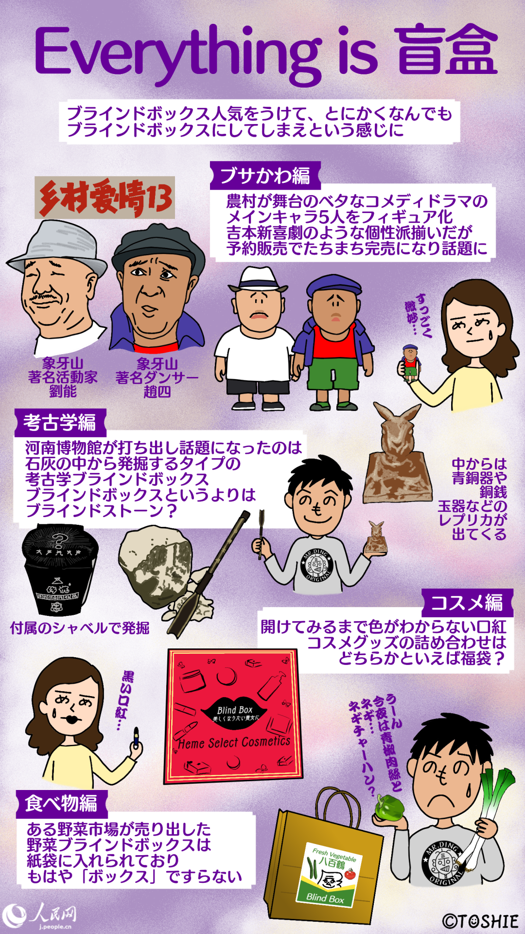 中国でシェア自転車などを代表とする「シェアリング」が流行った当時、とにかく何でも「シェア」をつけたサービスが登場した。なかには「シェア」というよりは「レンタル」なのでは?というものも。同様に、ブラインドボックス人気をうけて、今や「猫も杓子もブラインドボックス」といった裾野の広がりを見せている。「中身が見えない」というだけで、「盲盒」の名を冠し、消費者の目を引こうというわけだ。箱の中に入っているものも、アニメや漫画などの可愛らしさを売りにしたキャラクターフィギュアだけでなく、農村を舞台にしたベタな東北コメディドラマの登場人物をフィギュアにした商品も、先ごろ予約販売でたちまち完売になり話題になった。そのほか、文房具やコスメ、石灰の中から発掘するタイプの考古学ブラインドボックスなど多岐にわたり、ある野菜市場などは「野菜ブラインドボックス」まで売り出したほどだ。ここまでくると、もうほとんど「福袋」じゃないかという感じがしないでもない。