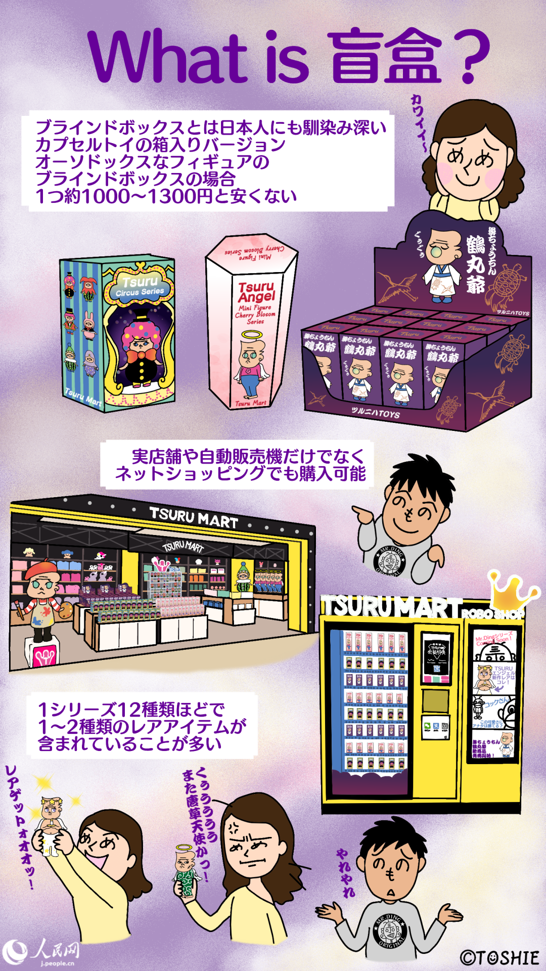 「盲盒」という言葉自体、日本語で紹介する際には、そのまま使用している場合や英語の「Blind Box」や「Mystery Box」から「ブラインドボックス」や「ミステリーボックス」と訳している場合など、その翻訳語にもまだばらつきが見える。ただその実体は、日本人にも馴染みの深いカプセルトイ(いわゆる、ガチャガチャ)の箱入りバージョンだ。とはいえ、カプセルトイが200~300円くらいが相場なのに対し、オーソドックスなフィギュアのブラインドボックスはおよそ1000~1300円ほどと決して安くはない。1シリーズ12種類ほどで、1~2種類のレアアイテムが含まれていることが多い。購入方法は、実店舗や自動販売機の他、ネットショッピングでも購入できる。また、「盲」という字がついていることからもわかるように、箱の中にどのアイテムが入っているかは、買って、開けてみないと分からないため、実店舗でひたすら箱を揺らして中身の見当をつけようとする人、自分の欲しいアイテムを手に入れるため、1ダース大人買いする人などもいる。