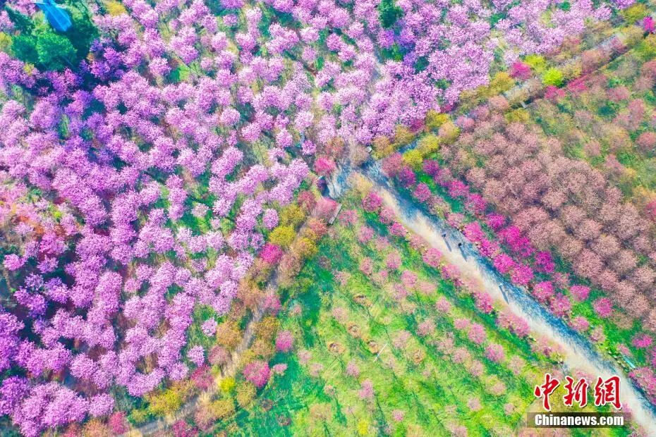 湖南省常寧市羅橋鎮廟山村桜花園では初春を迎え、約2平方キロメートルに広がる桜の花が春の暖かな日差しを受けて艶やかに咲き誇り、一面の美しい桜色が大地に春の彩りを添えていた。