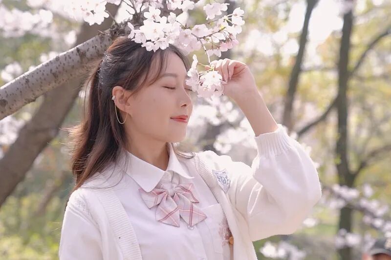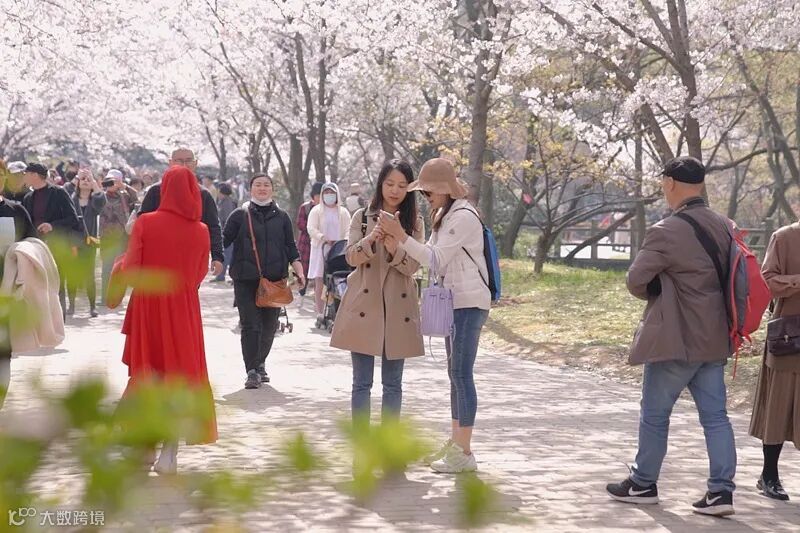 桜の木の下で記念写真を撮影する観光客(撮影・袁蒙)。