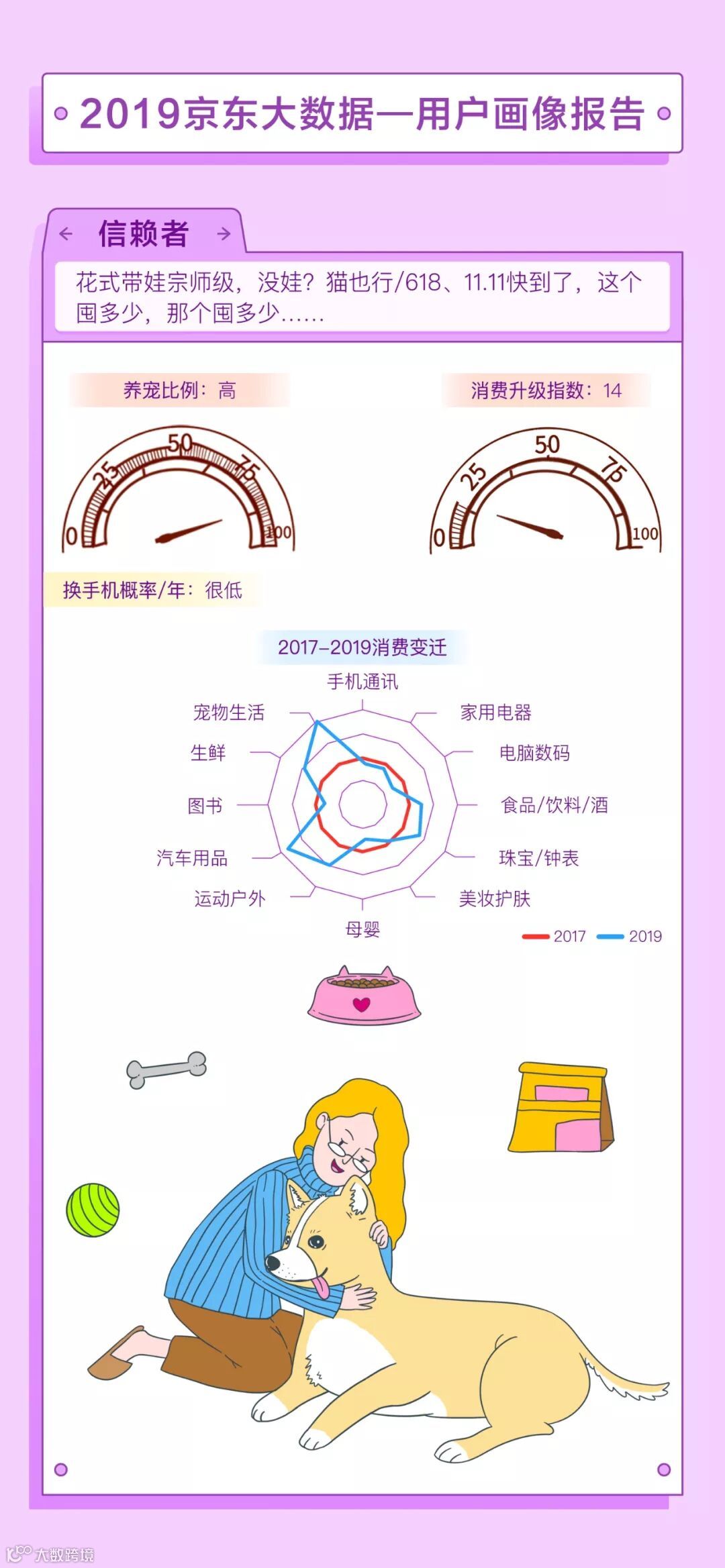 食品饮料的消费占比(较2017)略有下降,但生鲜类消费却在上升,同时从数据可以看出,拥有汽车或养宠物的年轻人明显在增加。另外,年轻人晚婚、不婚的趋势进一步明显,这反映在母婴类消费占比下降。