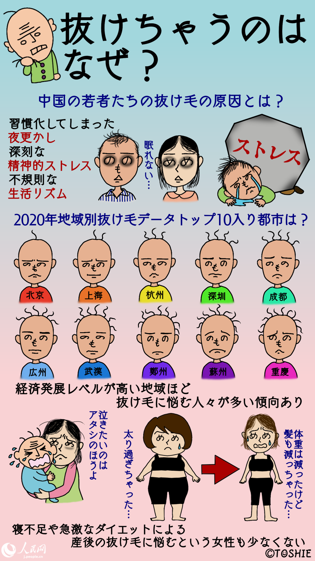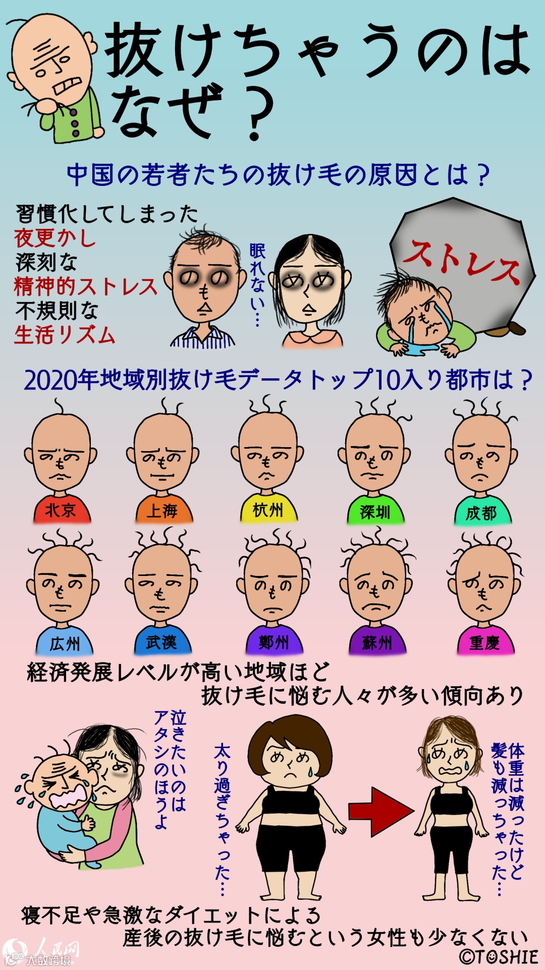 こうした原因を裏付けるデータもある。中国衛生健康委員会が2018年にまとめた中国国内の地域別抜け毛データによると、抜け毛に悩む人が少ない地域には、貴州省や内蒙古(内モンゴル)自治区、新疆維吾爾(ウイグル)自治区、甘粛省、海南省などが挙がっていた一方、抜け毛に悩む人が多かった地域は、広東省や北京市、江蘇省、上海市などだった。また、2020年に同委員会がまとめた地域別抜け毛データトップ10入りを果たした都市を見てみると、順に北京市、上海市、杭州市、深セン市、成都市、広州市、武漢市、鄭州市、蘇州市、重慶市となっており、経済発展レベルが高い地域ほど、抜け毛に悩む人々が多くなる傾向がみられた。