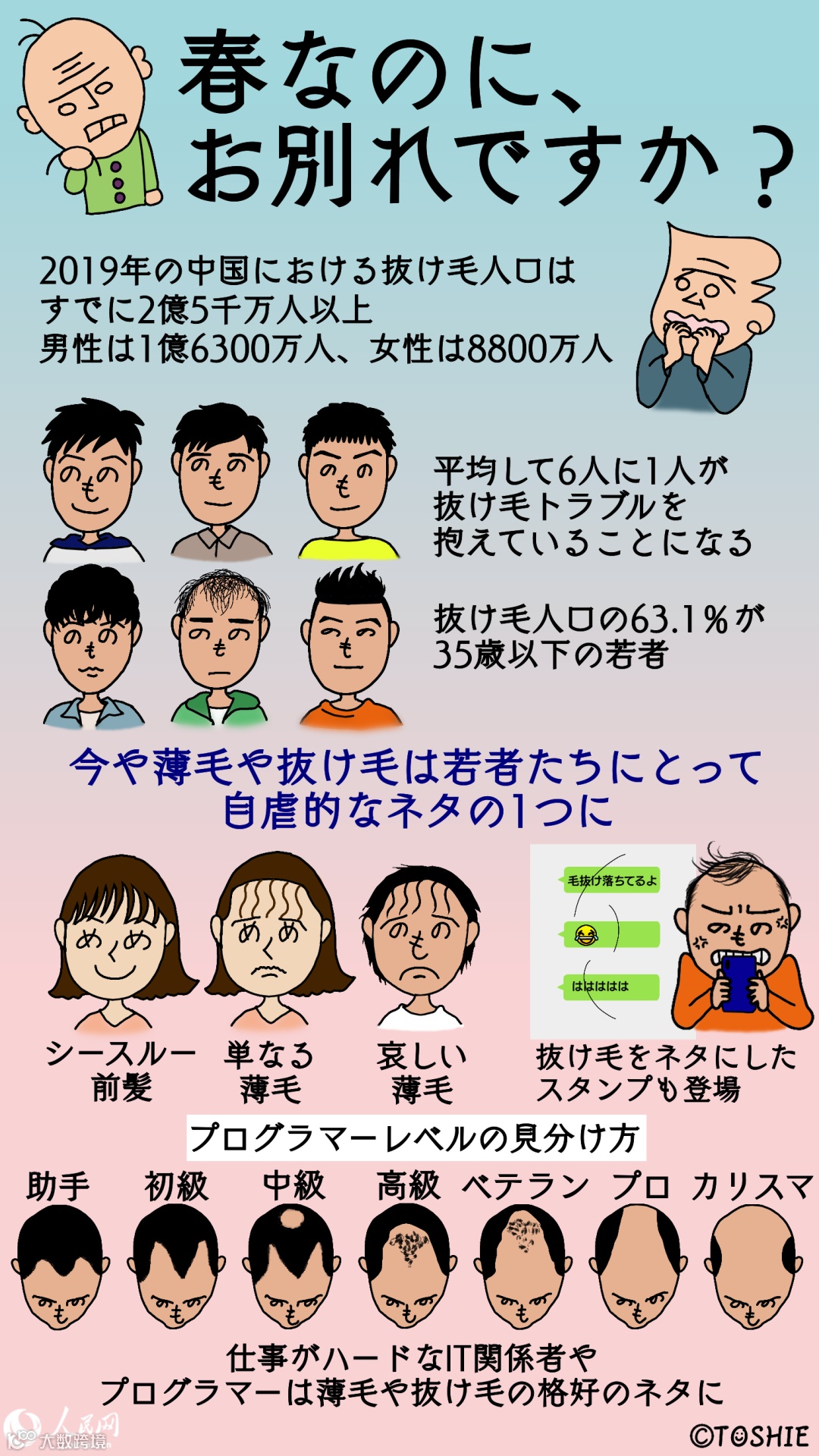 春と言えば、出会いの季節、別れの季節、変化の季節、そして抜け毛の季節…。1年の中でも抜け毛が多くなる季節となるこの時期、そんな悩みを抱えた人たちはどうしているのか?中国でもここ数年、薄毛や抜け毛の話題が人々の高い関心を集める話題となっている。今回はそんな中国の髪の毛事情を紹介していこう。