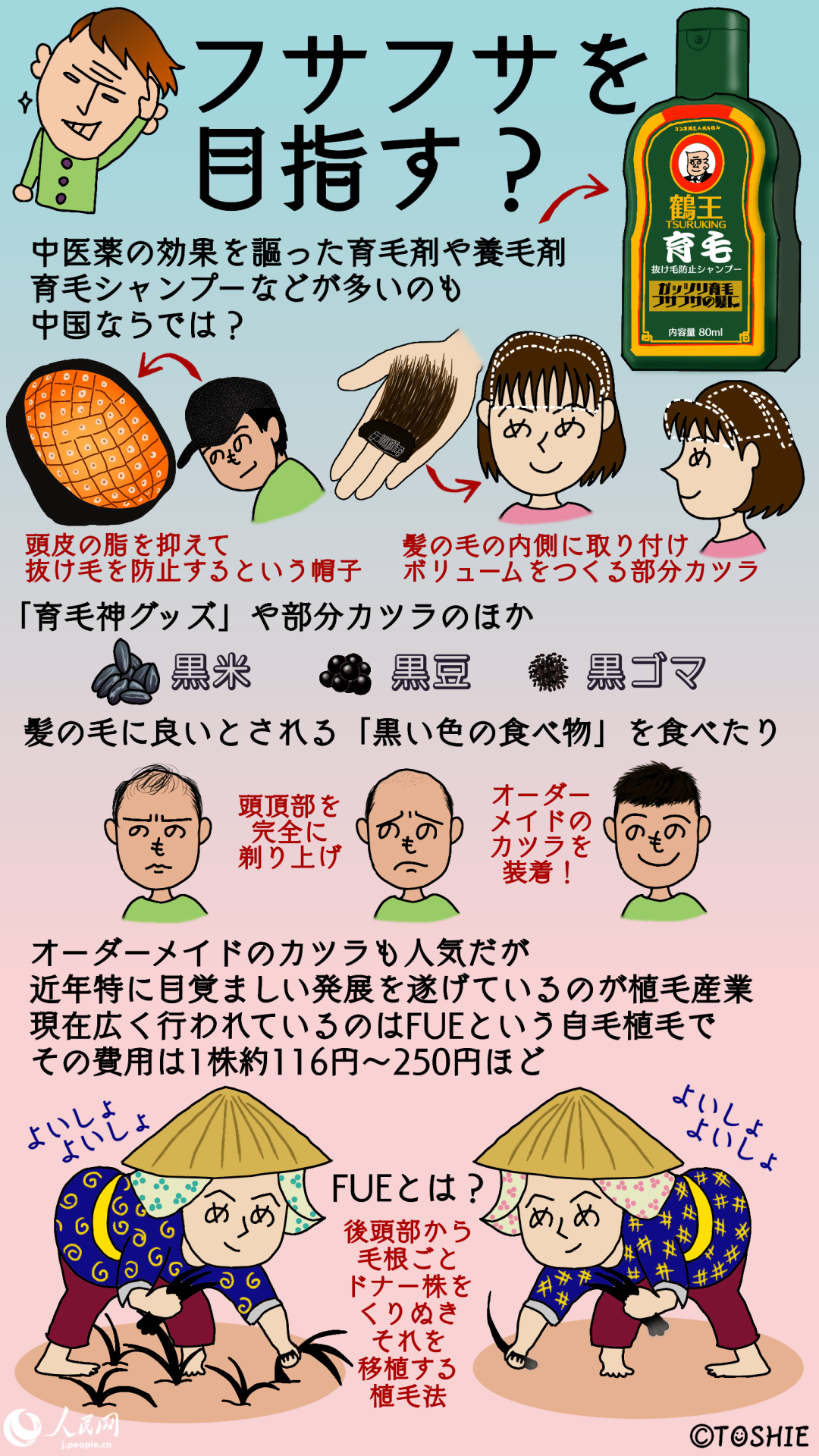 育毛剤や養毛剤、育毛シャンプーなどは中国にも実にたくさんある。中医薬の効果を謳ったものが多いのも、この国ならではだろう。また、髪の毛に良いとされる黒ゴマや黒豆、黒米など「黒い色の食べ物」を食べてみたり、ネットショップで売っている「育毛神グッズ」や部分カツラを買ってみたりと、まさに「髪の毛のためならエンヤコラ」。そして近年、特に目覚ましい発展を遂げているのが、植毛産業。2018年にはその市場規模が120億元を上回り、2020年には200億元を突破するとみられている。頭皮を帯状に切り取り、移植毛を採取するFUTや、パンチでくり抜いて移植毛を採取するFUEという手術法を使った自毛植毛がメインとなっており、もう書いているだけで痛そうな感じがするが、街中で植毛の広告を見かけることも増えていることから、植毛手術へのニーズも少なくないのだろう。
