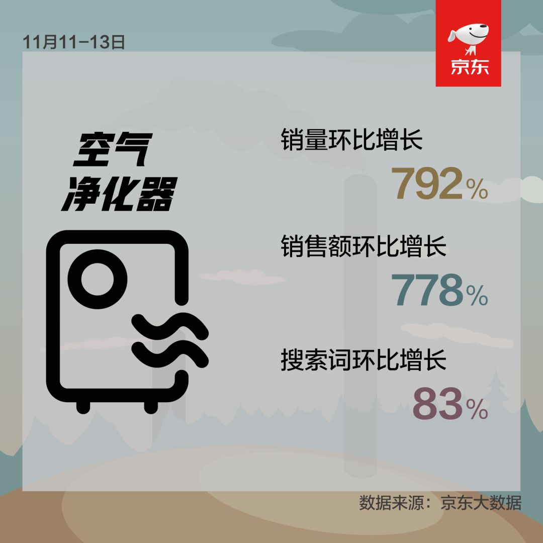 面对雾霾,求生欲让很多人留在室内。根据京东大数据来看,11月11日—13日期间,空气净化器销量大幅增长,其中销量环比增长792%、销售额环比增长778%