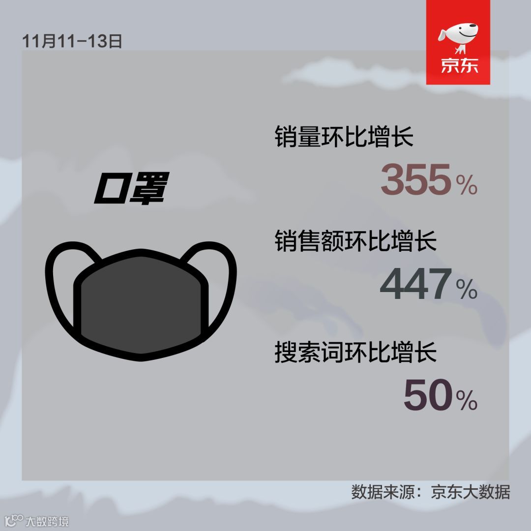 不管外面雾霾多么嚣张,生活还是一样的过。该上的班,该挤的地铁一样都少不了,口罩必然是出行人群的低配版防毒面具。戴上它,(假装)拥有一路新鲜空气。京东大数据显示,11月11日—13日期间,口罩销量激增,其中销量环比增长355%、销售额环比增长447%