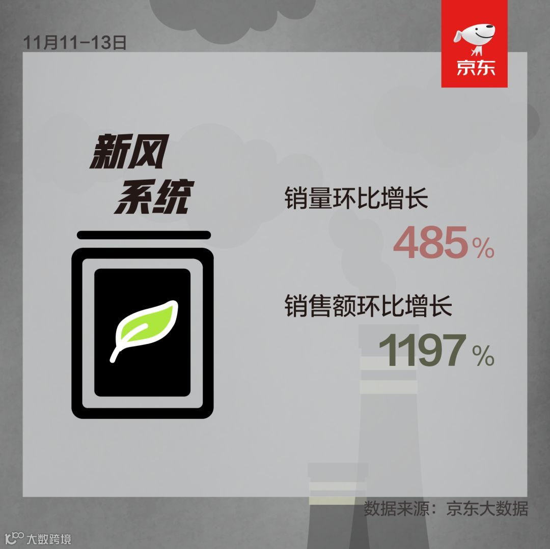 所谓新风系统,就是由送风系统和排风系统组成的一套独立空气处理系统,使用范围包含却不仅仅拘于对抗雾霾,是一件具有战略意义的装备。京东大数据显示,11月11日—13日期间,新风系统备受关注,销量环比增长485%、销售额环比增长1197%