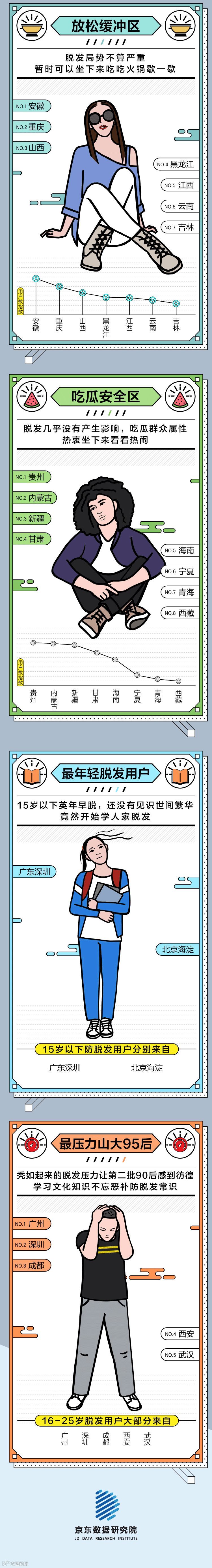 京东脱发地图,共分为红色危险区、严重警告区、放松缓冲区、吃瓜安全区五大区域,你处在哪一区,大数据来告诉你~