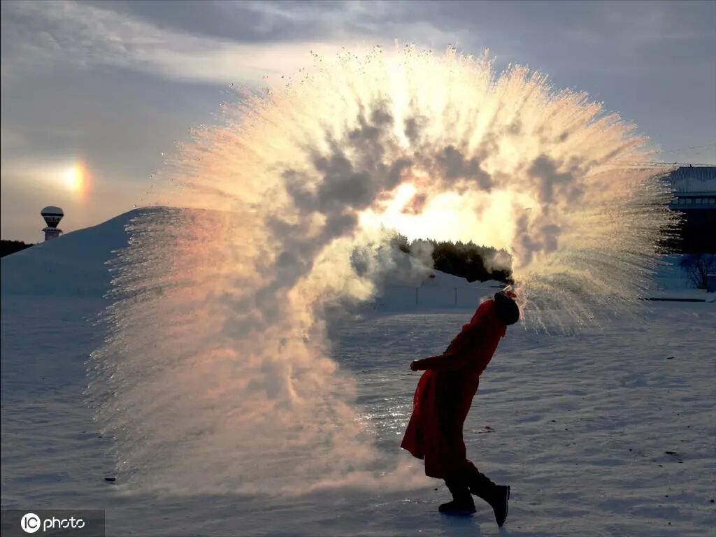 黒竜江省漠河市北極村で、最低気温はマイナス39度の極寒の中、「湯を一瞬で凍結させる」遊びを楽しむ観光客(写真著作権は東方ICが所有のため転載禁止)。