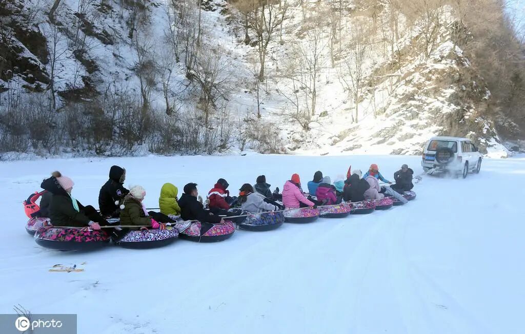 吉林省白山市撫松県興隆郷南天門村近くの川面で、オフロード車がスノーチューブ20個を引っ張って走行。スノーチューブで雪の上を滑り、スリルを楽しむ観光客たち(写真著作権は東方ICが所有のため転載禁止)。