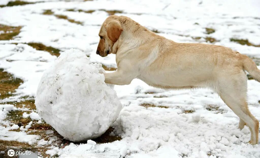 河南省洛陽市で、降雪後、飼い主が作った雪だるまで遊ぶ犬(写真著作権は東方ICが所有のため転載禁止)。