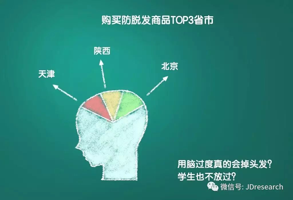 通过对比不同群体购买防脱发商品的数据,京东发现,还真有部分省份考生群体的购买占比明显高出其他群体。例如像天津、陕西和北京,就是考生群体购买防脱发商品相对最多的三个地域,消费占比明显高出全国平均水平。特别是天津和陕西,都已超出全国平均水平一倍以上。