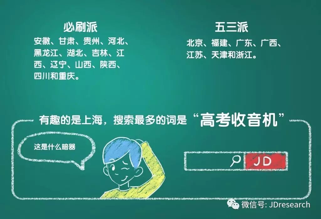 最有趣的是上海,搜索最多的居然是“高考收音机”…这是什么“暗器”?上京东搜搜就你就了然了 。