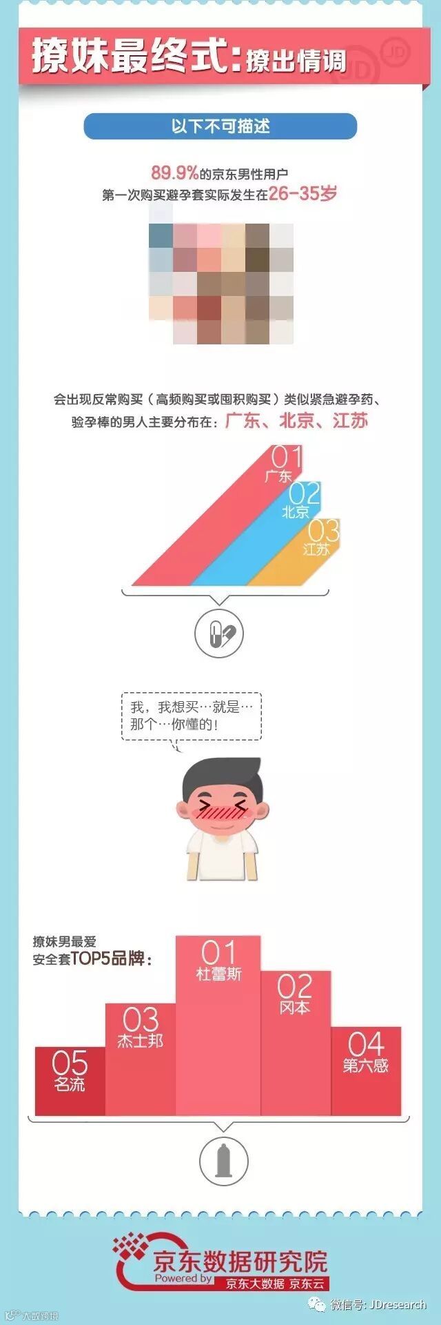撩妹的最终结果就要“不可描述了”——89.9%的京东男性用户第一次购买套套发生在26-35岁,最爱品牌杜蕾斯、冈本、杰士邦。