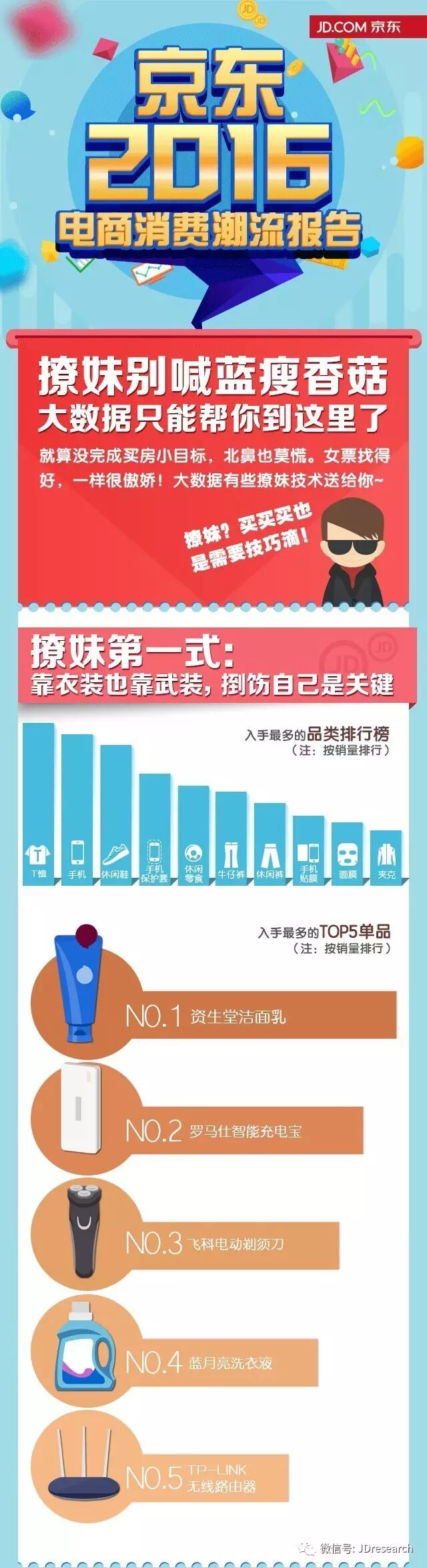 单身男靠啥撩妹的?《2016京东电商消费潮流报告》指出,撩妹既靠衣装也靠武装,清洁、穿着、手机等硬货样样不能落。T恤、手机、休闲鞋等都是他们入手最多的品类,资生堂洁面乳、罗马仕智能充电宝、飞科剃须刀成为他们入手最多的单品。