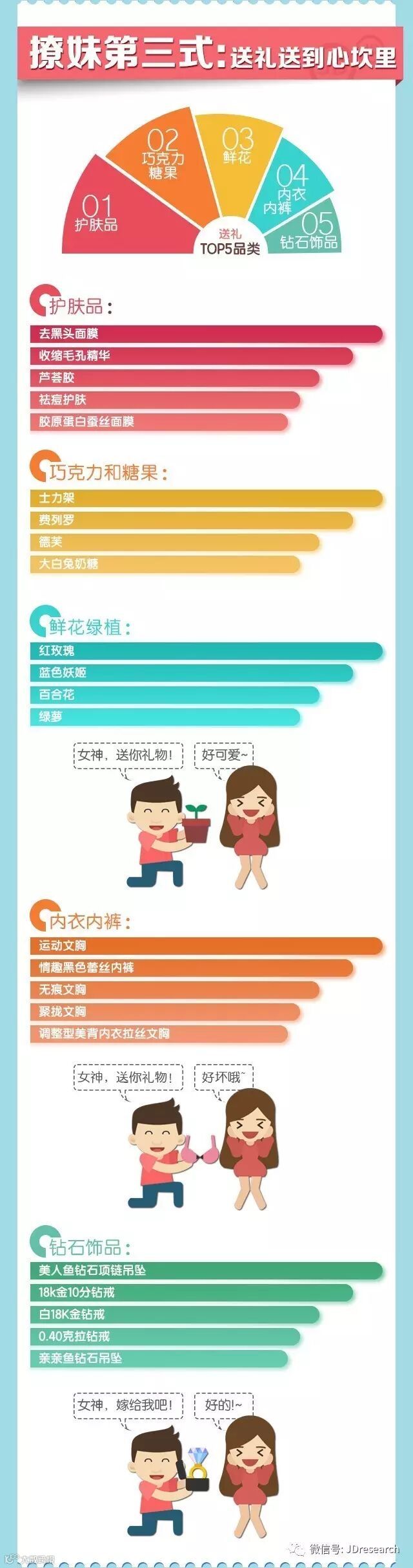 他们在给女生送礼时也是煞费苦心,护肤品、巧克力、花、内衣甚至钻石,送出别样情趣。护肤品中,去黑头面膜、收缩毛孔精华、芦荟胶等产品受追捧;士力架、费列罗、德芙等巧克力产品也是人气王;鲜花上看,红玫瑰、蓝色妖姬、百合花帮单身男表达最多爱意。