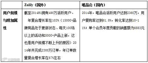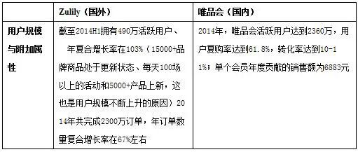 (3)用户规模:注重客户粘性的提升,培养粉丝用户,打造品牌影响力。闪购模式是非常适合培养粉丝客群的模式,究其原因,主要是闪购模式具备品牌吸引力和价格优势,因此商品转化率和复购率较高,长此以往,用户对闪购电商的依赖性会逐渐增加,从而形成电商品牌认知度和较高影响力。下面以Zulily和唯品会为例,介绍其用户规模及附加属性: