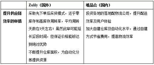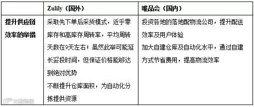 (1)供应链效率:注重仓储面积提升和仓储自动化水平提高;注重最后一公里的配送;加强供应链管控力。闪购模式于品牌商和供应商而言之所以具有吸引力,很大程度上取决于闪购模式能够给其带来存货周转速度的加快;而对于消费者而言,良好的物流和配送服务又能给其带来深刻的品牌印象和认知。因此,作为重要的核心竞争力之一,提升供应链效率非常有必要。下面以Zulily和唯品会为例,阐述提升供应链效率的举措: