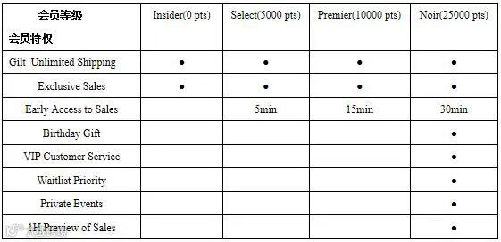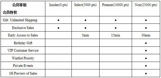 Gilt的会员分四档、特权多样化,且最高等级会员(Noir)享受特权比其他会员多出五种。如下表所示: