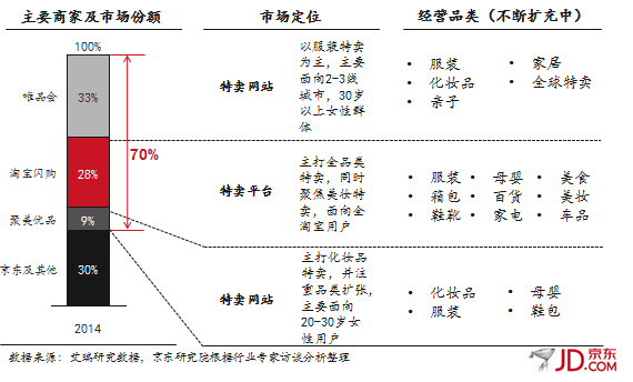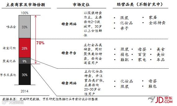 截至2014年底,70%的市场已经被唯品会、淘宝、聚美等电商瓜分,剩余30%份额主要有天猫闪购、京东闪购、尚品网等闪购玩家。