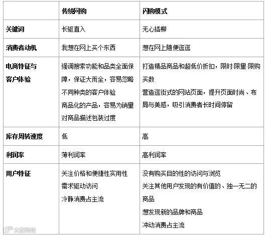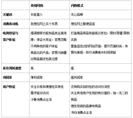 闪购模式和传统网购的主要区别在于:传统网购注重大而全,尽力满足所有消费者一站式购物需求,在商品种类和商品搜索等方面占有优势;闪购模式营造买逛式氛围,充分挖掘消费者购物心理,最终转化成购买行为。