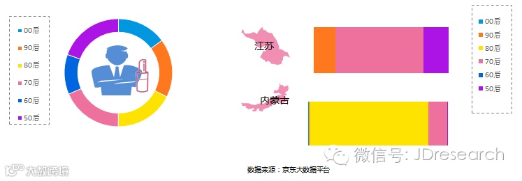 女性饮酒成情趣:随着红酒类产品越来越赋予用户优雅、时尚的生活元素,更多的女性将饮酒小酌纳入生活,有三分之一的酒类消费来自女性用户。全国来看,北方女性酒类消费高于其它地区,五成的女性酒类消费来自天津、北京、海南、黑龙江、山东;更多80后女性在生活之余通过饮酒为生活增色,尤以山东、河南居多。此外,北京、吉林、天津、重庆的60后女性的酒类消费能力均高于70后。
