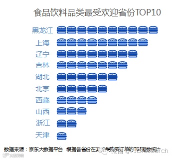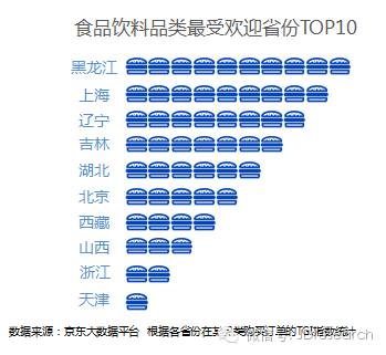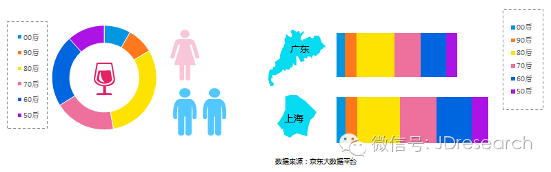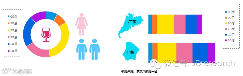 南方用户最能喝:南部和东部用户更爱饮酒,酒类商品在整个网上超市购物订单量占比排行中,广东、上海、福建、天津、黑龙江名列前茅。从年龄上看,80后用户买走了三分之一的酒类产品,海南、福建、山东、黑龙江的80后用户酒量最为突出,广东则是90后更爱饮酒。