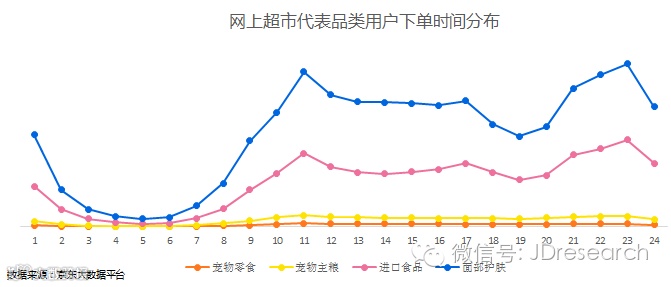网络超市订单高峰产生在“下班前”和“睡前”时段,11点和17点和23点皆为高点;10点-11点是进口零食和面膜护肤产品的单量高峰,白领们利用这段时间“逛超市”,提高自己的生活质量。