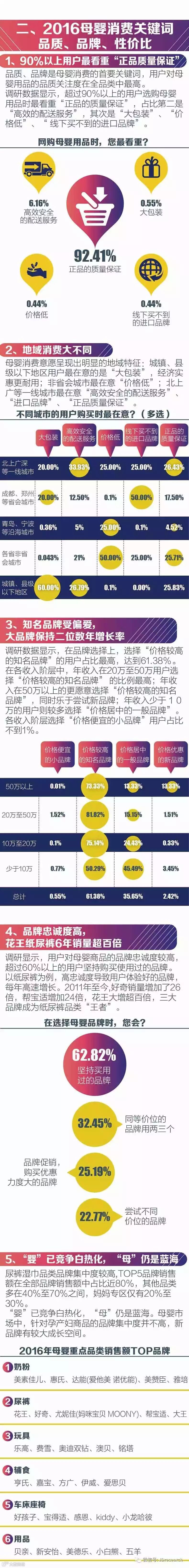 报告显示,超过78%的家庭表示在有条件情况下愿意生“二孩”,五六线城市生育意愿高;反映到母婴市场中将带来五六线城市爆发二孩红利,一二线城市享高端消费趋势; 90后、70后新用户增长快,奶爸育儿角色提升;知识型育儿消费渐成“刚需”,中产家庭更看重智力消费;92%用户最关注品质,近一半用户受促销影响,追求高性价比;六成用户选择大品牌,“妈妈经济”成蓝海。