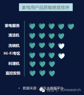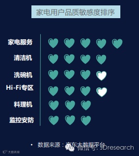 家电消费者很注重商品的用户评价,对评论极度敏感和高度敏感的用户超过了52%,他们在购买时会着重参考其他用户的使用体验。这些家电网购消费者并不十分热衷于促销,对大力促销敏感的用户占比相比京东全站低了29.62%,可见在家电这一领域,相对于价格,产品质量和服务才是硬道理。