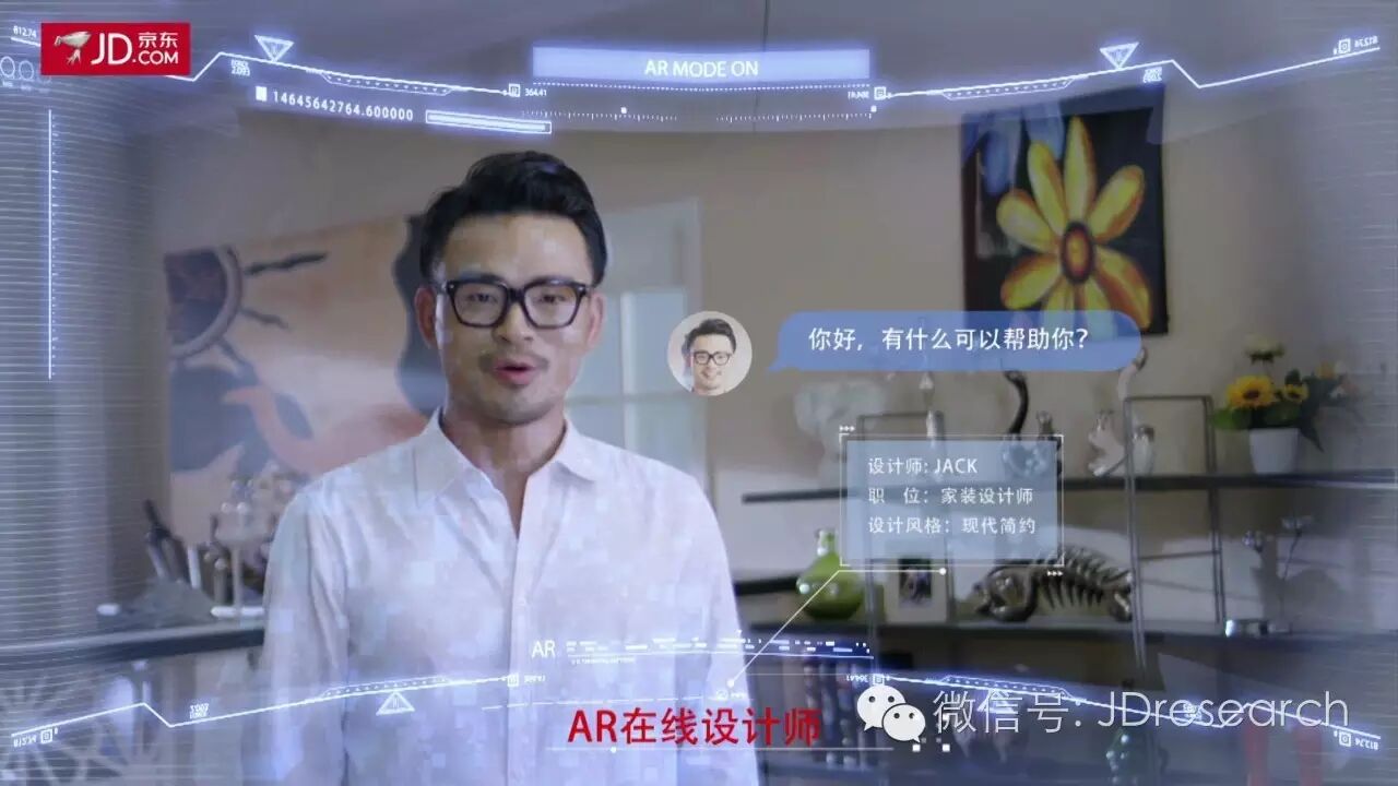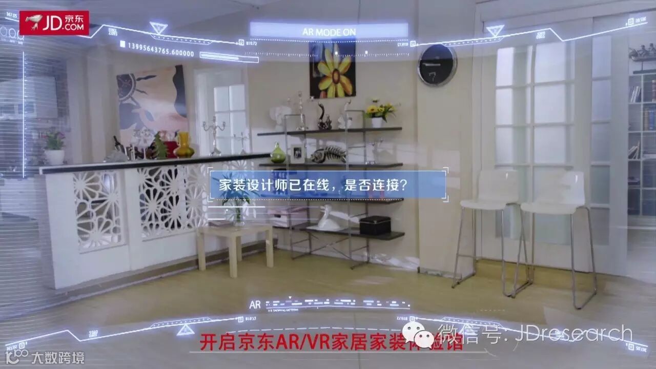 ▲首先在京东的VR/AR战略当中,AR相当关键,视频在一开始就展示了用户通过AR来进行家装设计,你可以看到设计师通过AR设备能够远程与用户进行通讯。