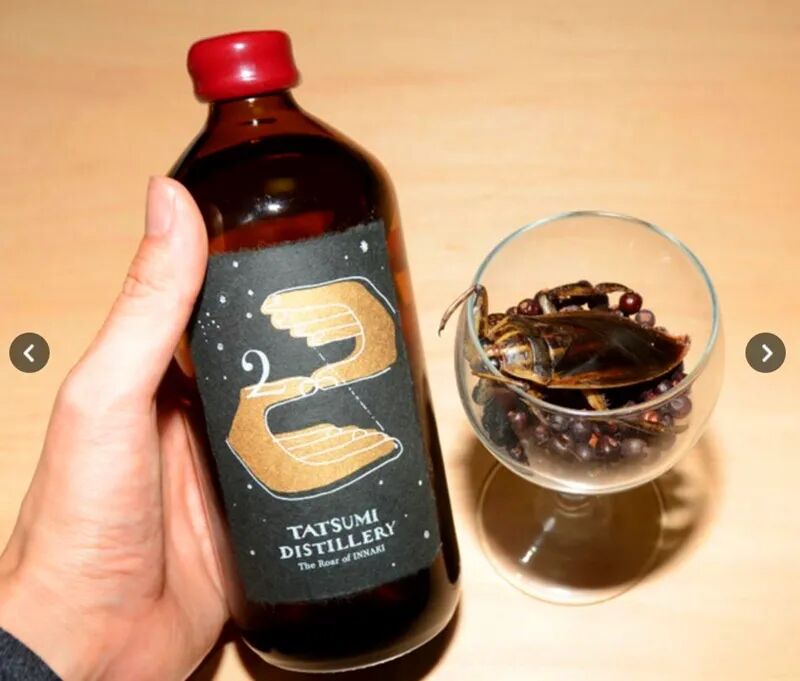 昆虫料理活动中的“大田鳖泡杜松子酒”。(图片来源:日本《朝日新闻》网站)