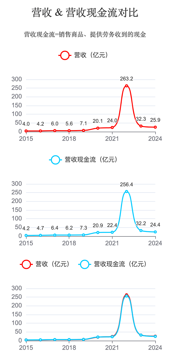 2022年业绩出现了一个极端峰值:营收飙升至263.2亿元,净利润高达160.3亿元。这一现象得益于iHealth新冠抗原试剂盒在海外市场的爆发性需求。随后,随着疫情平复,需求退潮,营收和利润在2023年快速回落,至2024年分别降至25.9亿元和16.7亿元。尽管如此,2024年的业绩规模仍远高于疫情前水平。