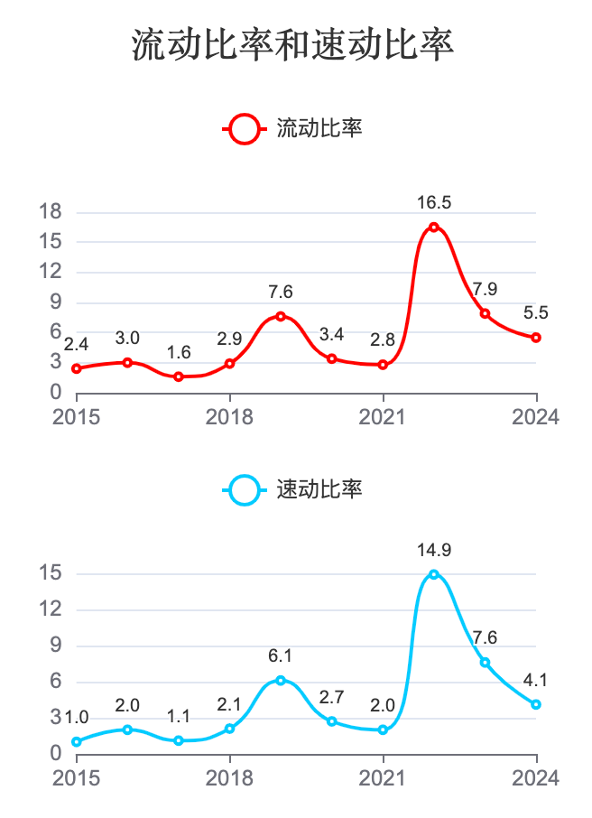流动比率和速动比率大幅波动,但始终处于高水平。这反映出公司拥有的流动资产足以覆盖负债,短期偿债能力较强。