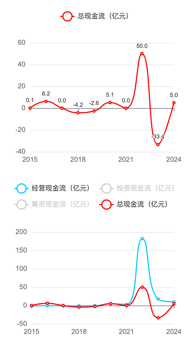 2023年经营现金流从峰值大幅回落,2024年为9.9亿元。这与营收下降趋势一致,表明主业创造的现金流入回归常态水平,但已能稳定产生净流入。