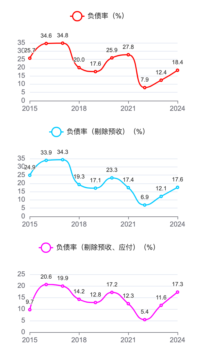 负债水平大幅波动,但整体下降。负债率从30%以上,下降到2024年18.4%,剔除预收、应付之后17.3%,财务结构安全。