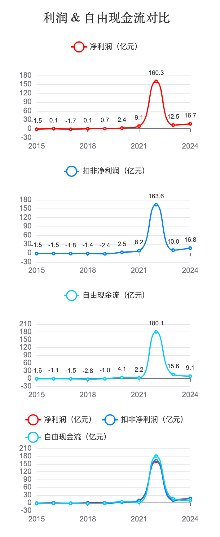 自由现金流和净利润也基本重合,2022年自由现金流超过了净利润,2024年自由现金流9.1亿元又低于净利润16.7亿元,利润含金量较峰值时期有所下降。