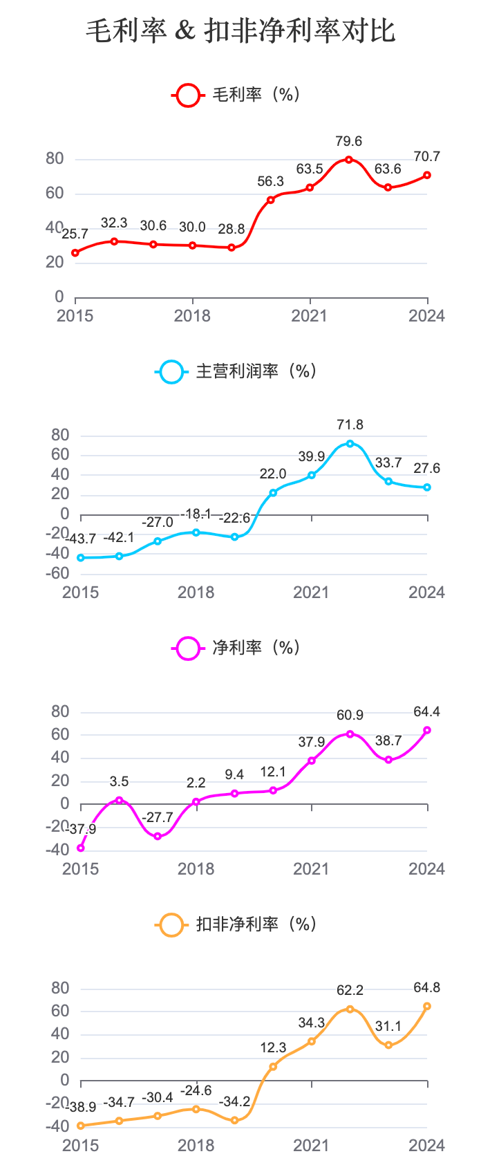 2024年,扣非净利率64.8%与主营利润率27.6%出现了巨大差距。这是由于公司利润的主要贡献者从产品销售(主营利润)转变为金融投资等收益。