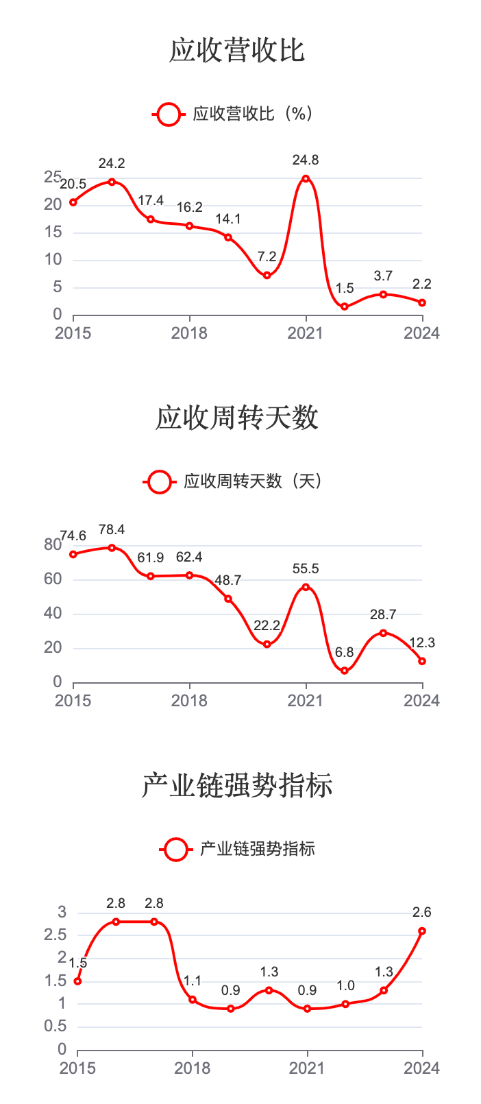 产业链强势指标在2024年达到2.6,多数年份该指标大于1,表明公司在产业链中的话语权较强。