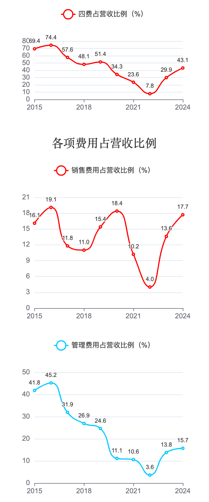 管理费用占比从2015年的41.8% 大幅降至2024年的15.7%,效率提升显著。但近期的回升也提示,在营收下降时,维持组织运转的固定成本压力会增大。