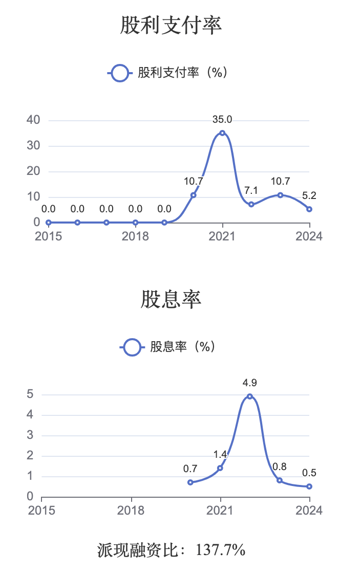 公司在2020年之前业绩很差,没有进行现金分红。2020年开始派息,股利支付率在5%至35%之间大幅波动。这表明公司在实现盈利后,开始重视股东回报,但支付政策保守,并未将大部分利润用于分红。