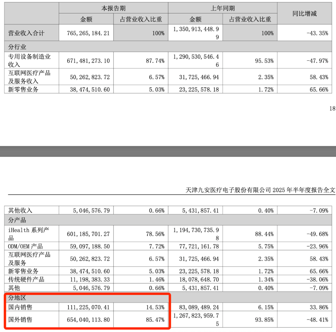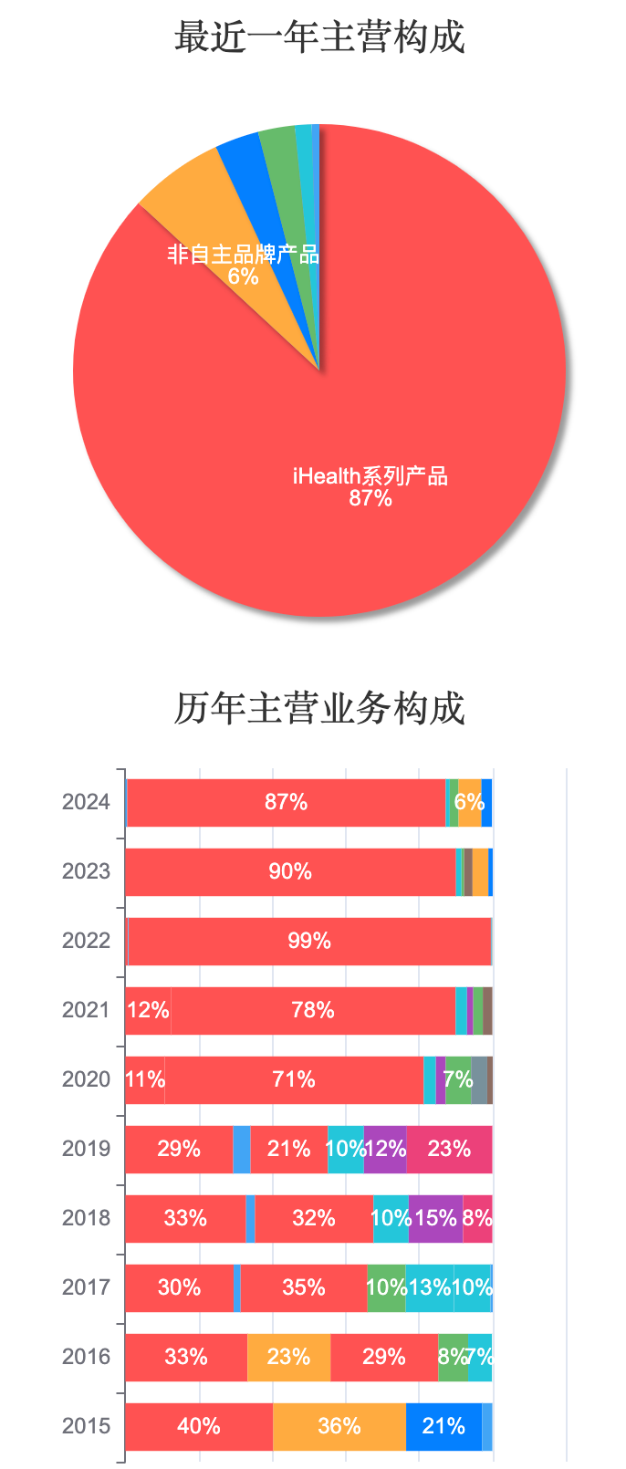 2020年之前,公司业务构成相对多元。自2020年起,iHealth系列产品收入占比急剧攀升,2022年达到99%,并在最近一年仍维持在87%的绝对主导地位。从传统的ODM/OEM模式,转变为以“iHealth”自主品牌为核心,并聚焦海外市场。