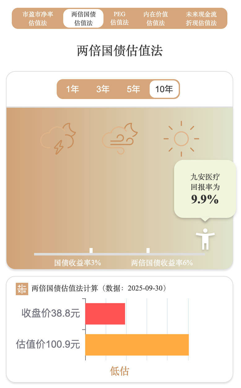 “两倍国债估值法”计算出公司的“回报率”为9.9%,高于两倍国债收益率,结论为“低估”。